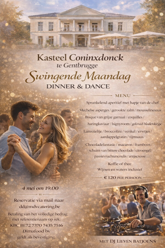 Beleef een unieke avond in Kasteel Coninxdonck tijdens Swingende Maandag - Dinner & Dance, elke eerste maandag van de maand. Geniet van een verfijnd menu terwijl je meteen de dansvloer op kan, begeleid door de sfeervolle beats van DJ Lieven Batjoens.